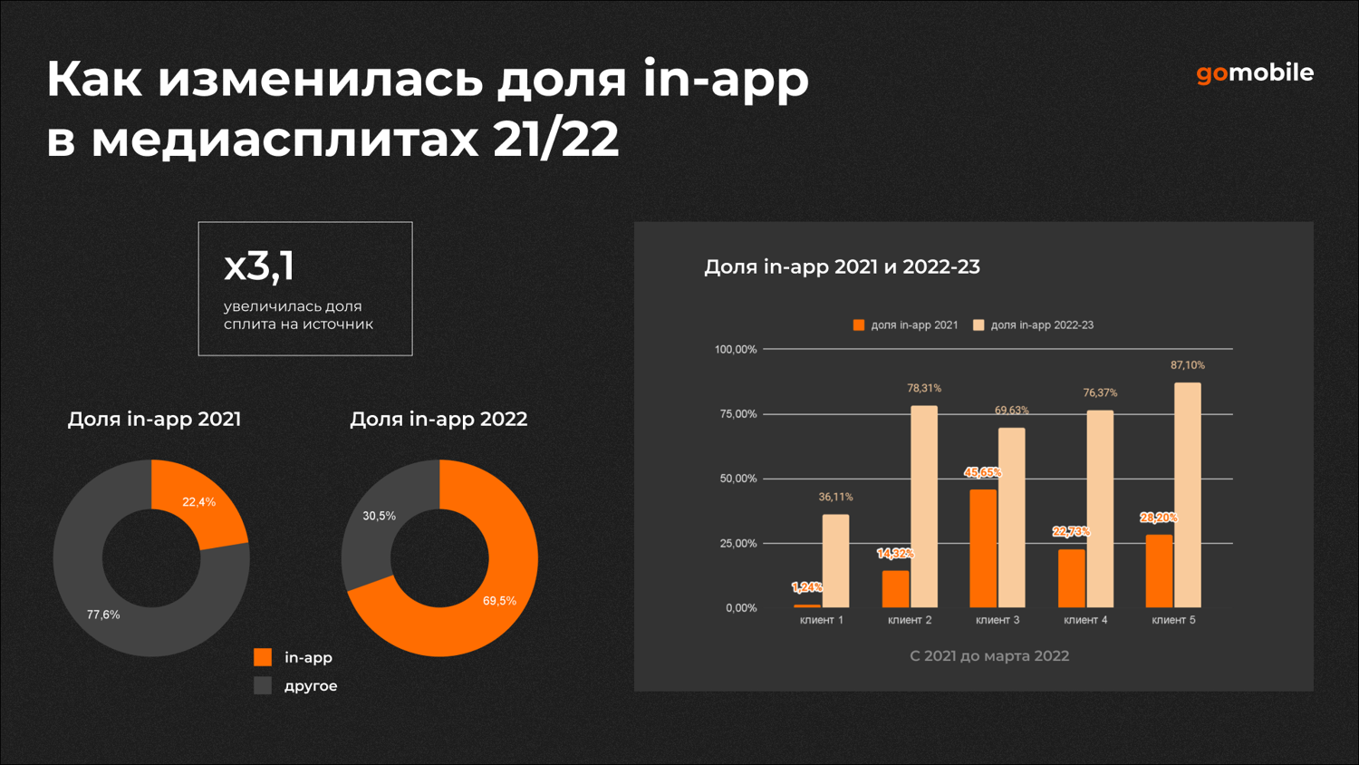 Агентство мобильного маркетинга Go Mobile проанализировало биллинги и доли in-app-трафика в бюджетах клиентов агентства, изменения в медиасплитах до и после февраля 2022 г., а также выделило положительные стороны in-app