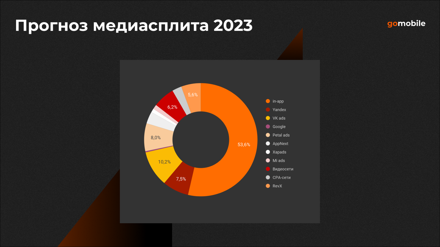 По прогнозам, в 2023 г. большая часть расходов придется на managed in-app —почти 54%. А на OEM и видеосети — 13,8 и 6,2% соответственно.