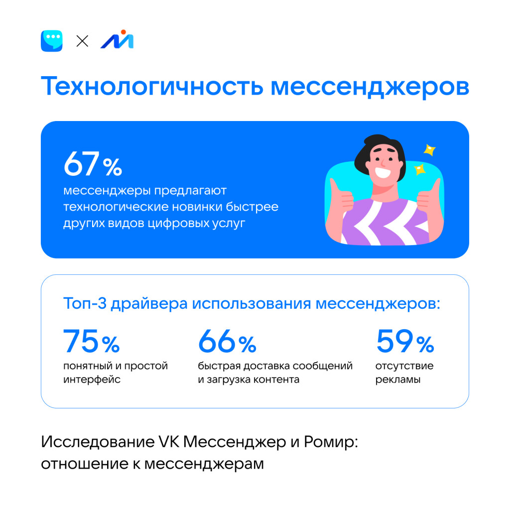 Около 63% опрошенных россиян считают мессенджеры универсальными платформами,на которых можно и общаться, и пользоваться услугами. Половина респондентовсообщили, что за последние несколько лет мессенджеры стали болееинновационными, а 58% отметили повышение уровня удобства: пользователи ценят вних понятный и простой интерфейс — 75%, быструю доставку сообщений и загрузкуконтента — 66%, а также отсутствие рекламы — 59%, согласно данным опроса«Ромира» и «VK Мессенджера».