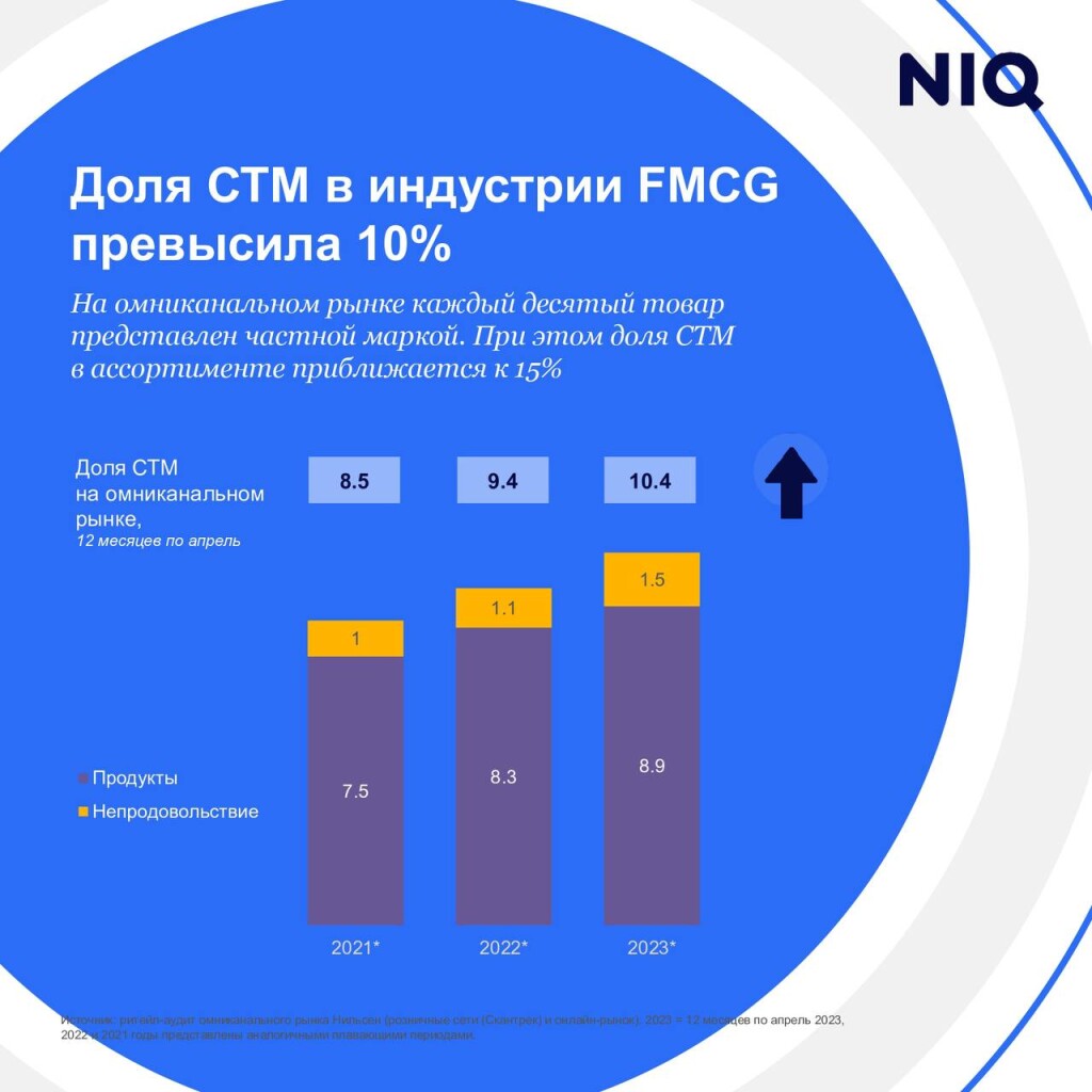 Доля продаж собственных торговых марок (СТМ) на омниканальном рынке,включающем как онлайн-, так и офлайн-каналы, превысила 10% в денежном выраженииза 12 месяцев — с апреля 2022 по апрель 2023 г., согласно данным NielsenIQ.