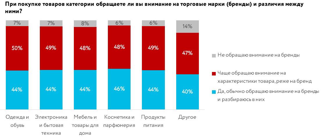 Для половины российских покупателей потребительские характеристики товараважнее, чем бренд. Доля тех, кто ориентируется прежде всего на бренды иразбирается в них, составляет 42%. Оставшиеся 8% покупателей ответили, что неинтересуются торговыми марками и не видят различий между ними.