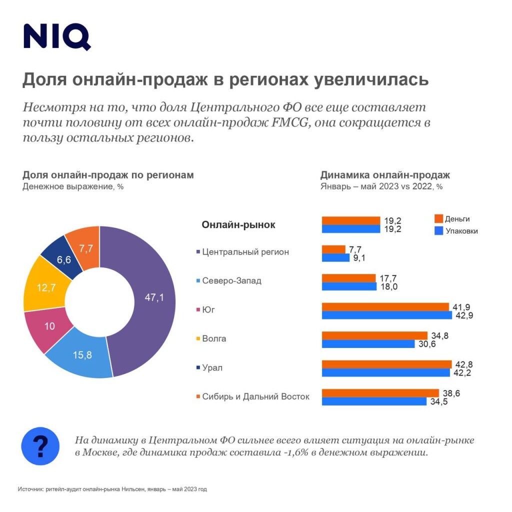 Доля регионов в структуре онлайн-рынка FMCG выросла более чем на 5 п. п. вянваре — мае 2023 г. по сравнению с аналогичным периодом годом ранее. Этопроизошло преимущественно за счет снижения доли Центрального федеральногоокруга (ЦФО), на который сейчас приходится порядка 47% денежного оборота,согласно данным NielsenIQ.