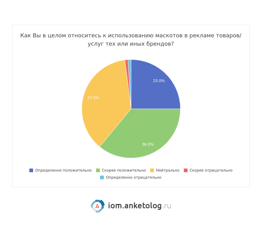 Более 90% опрошенных россиян сообщили, что им нравится, когда в рекламебрендов задействованы именно маскоты, а не актеры. Около 60% респондентовположительно относятся к использованию маскотов в рекламе. Почти 75% опрошенныхкогда-либо встречали таких персонажей в кампаниях, согласно данным опросаAnketolog.ru.