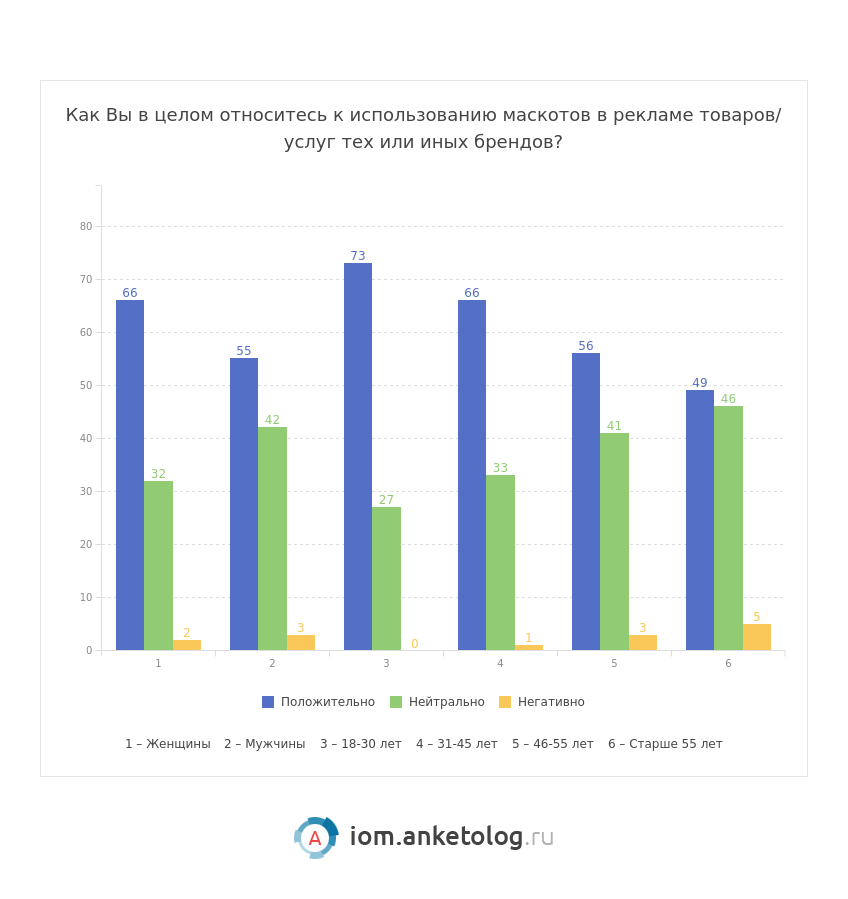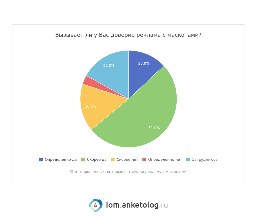 У 58% опрошенных маскоты вызывают положительные эмоции. Почти 70%респондентов считают, что маскоты делают бренд более запоминающимся. Около 46%россиян считают, что благодаря таким персонажам бренд становится более«дружелюбным и готовым к общению с аудиторией».