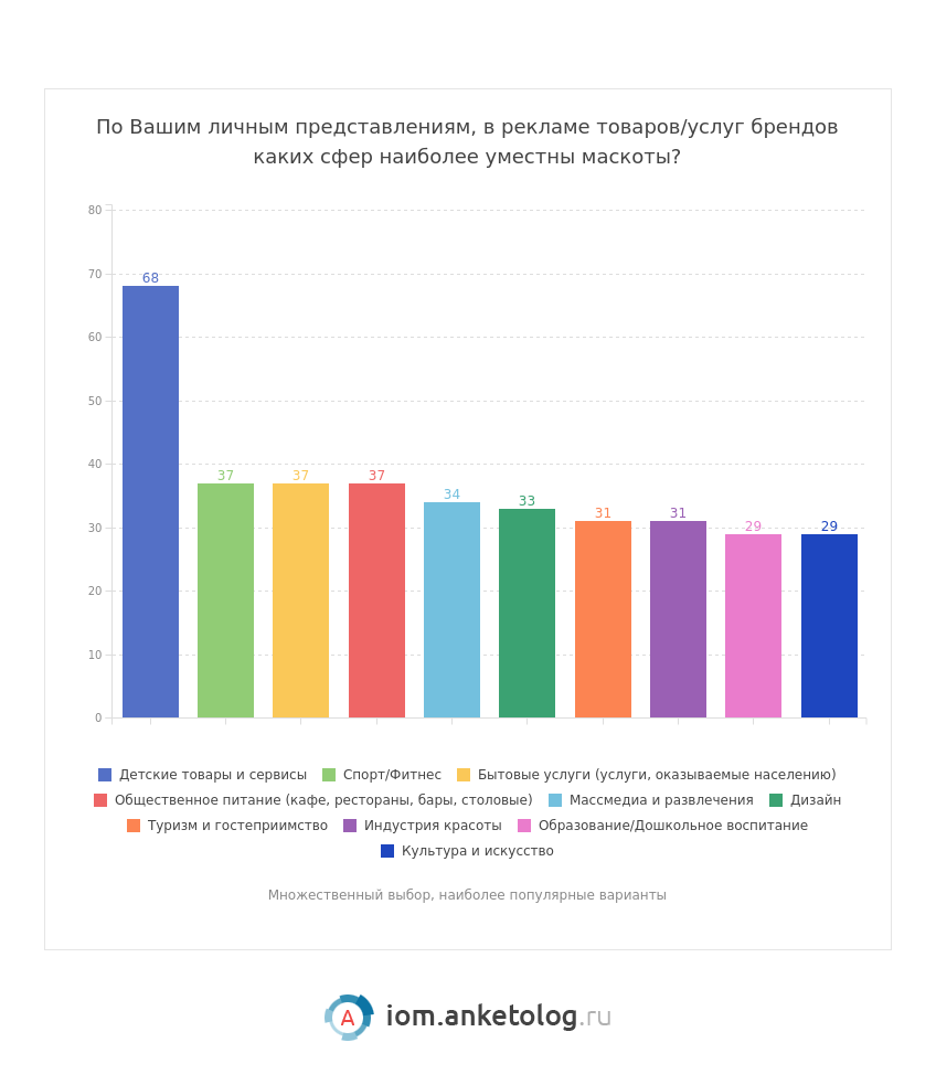 Около 60% россиян считают, что маскотов необходимо использоватькомпаниям в категории «Детские товары и сервисы», 37% — «Спорт и Фитнес»,«Бытовые услуги» и «Общественное питание».