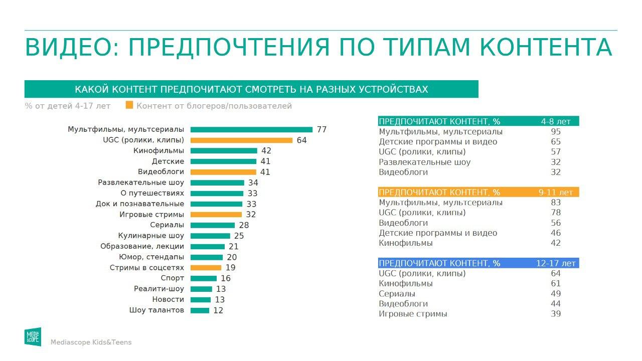 Мультфильмы и мультсериалы остаются самой любимой категорией видео у младшихвозрастных групп. Для современных детей, которые смотрят видео с разныхустройств, интереснее становятся ролики и клипы, создаваемые блогерами. Такойконтент занимает второе место в детском топе сразу после профессиональноймультипликации.
