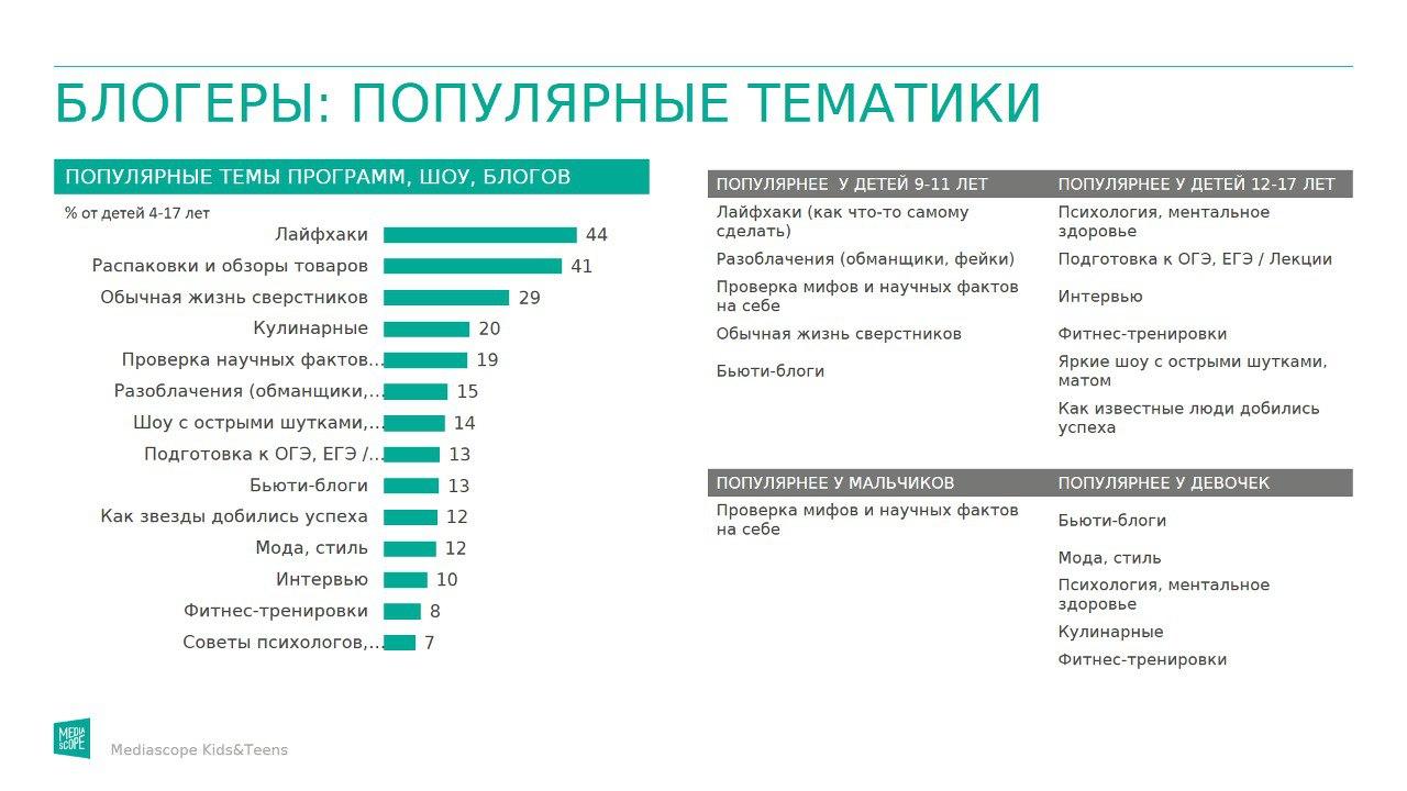 В области блогерского контента дети, как и взрослые, часто смотрят лайфхаки(44% детей 4–17 лет) и распаковки и обзоры товаров (41%).
