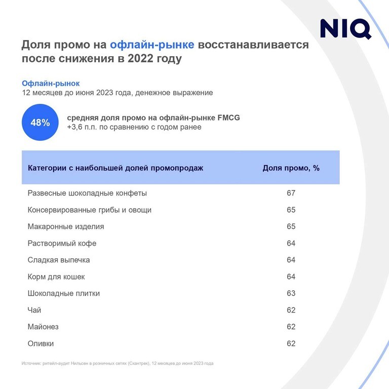 Средняя доля продаж товаров со скидкой на офлайн-рынке FMCG выросла на 3,6п. п. — до 48% — с мая 2022 г. по май 2023 г.,следует изрезультатов аналитики NielsenIQ.