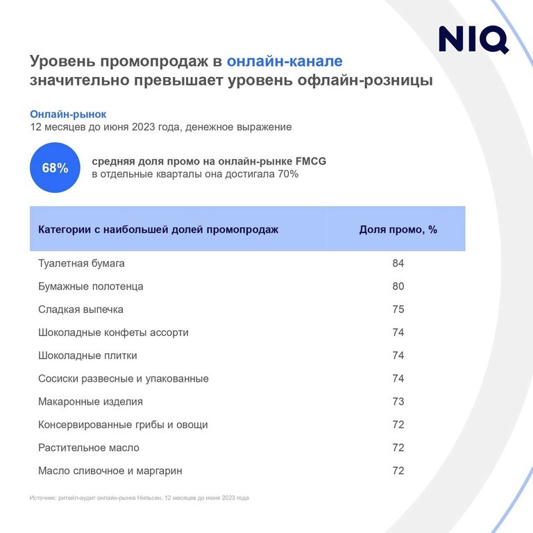 В онлайне доля промопродаж достигла 68%. Там преобладают другие категории:туалетная бумага (84%), бумажные полотенца (80%), сладкая выпечка (75%),шоколадные конфеты ассорти, плитки шоколада и сосиски (74%).