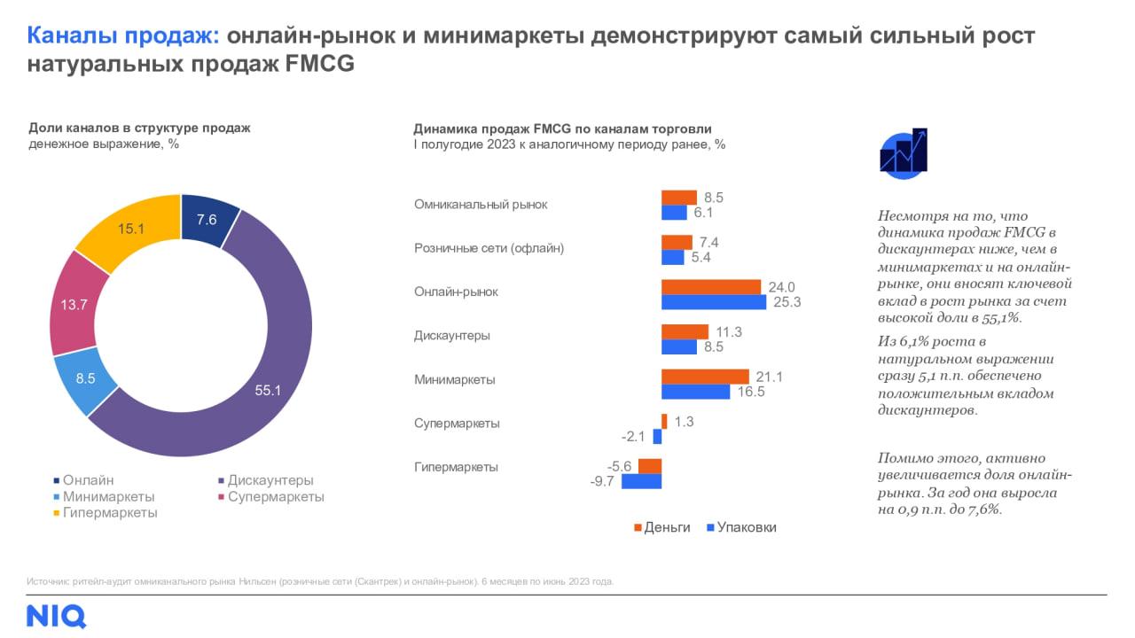Однако основной вклад в рост рынка внес формат дискаунтеров. Из 6,1% роставсего омниканального рынка сразу 5,1 п. п. обеспечено положительным вкладомтаких магазинов. Это происходит за счет высокой доли дискаунтеров в структурепродаж всех FMCG — в денежном выражении она составляет более 55%. Помимо этого,активно увеличивается доля онлайн-рынка. За год она выросла на 0,9 п. п. —до 7,6%.