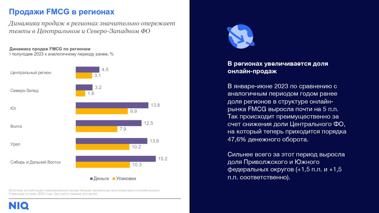Такое перераспределение на омниканальном рынке отчасти происходит за счетразвития интернет-торговли в регионах. В январе — июне 2023 г. по сравнению саналогичным периодом годом ранее доля регионов в структуре онлайн-рынка FMCGвыросла почти на 5 п. п. Это происходит преимущественно благодаря снижению долиЦентрального федерального округа, на который теперь приходится 47,6% денежногооборота.