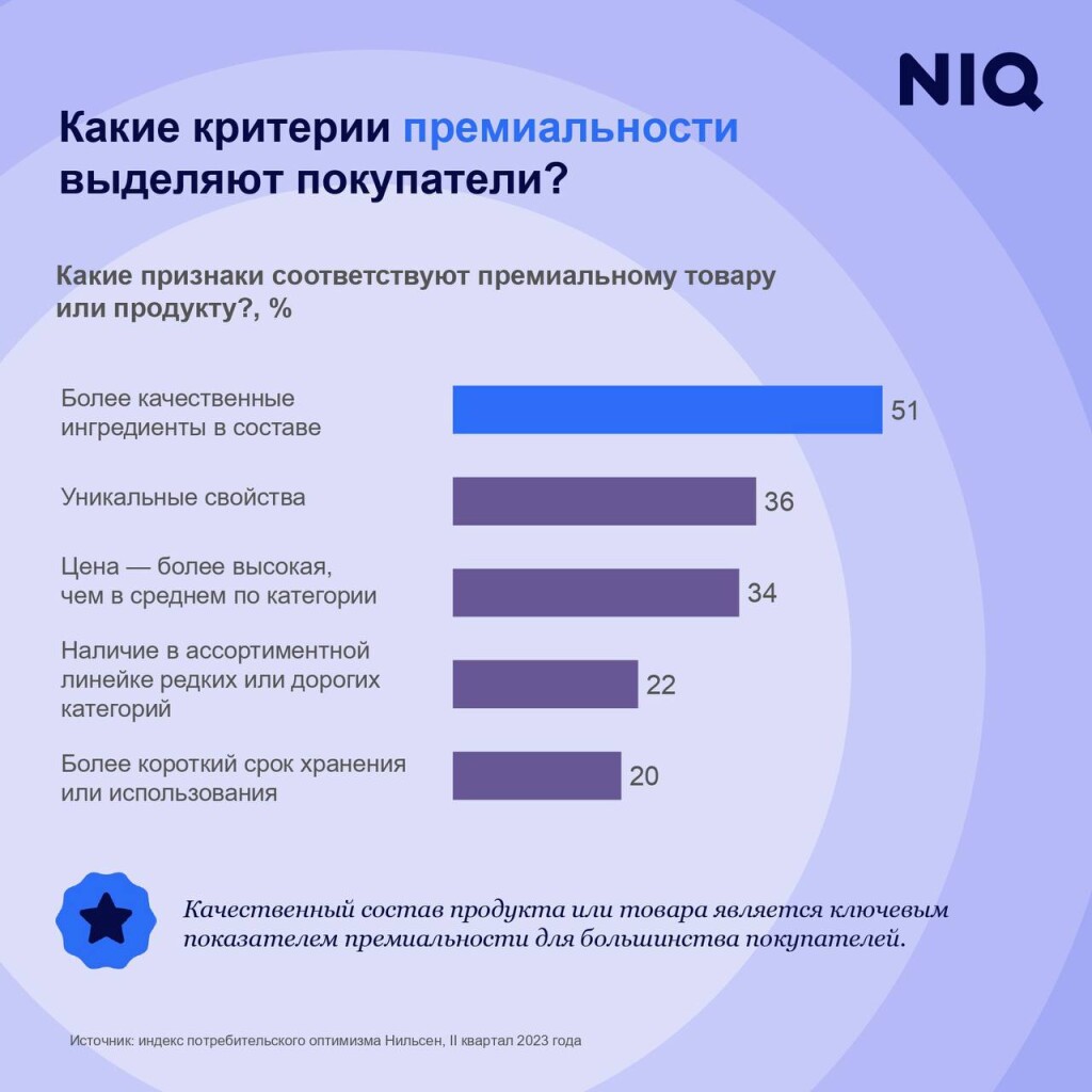 Почти 35% респондентов считают, что высокая цена — это главное качествопремиального товара. Однако для большинства (51%) ключевым показателемстал хороший состав продукции. На втором месте — уникальные свойства(36%), согласно данным NielsenIQ.