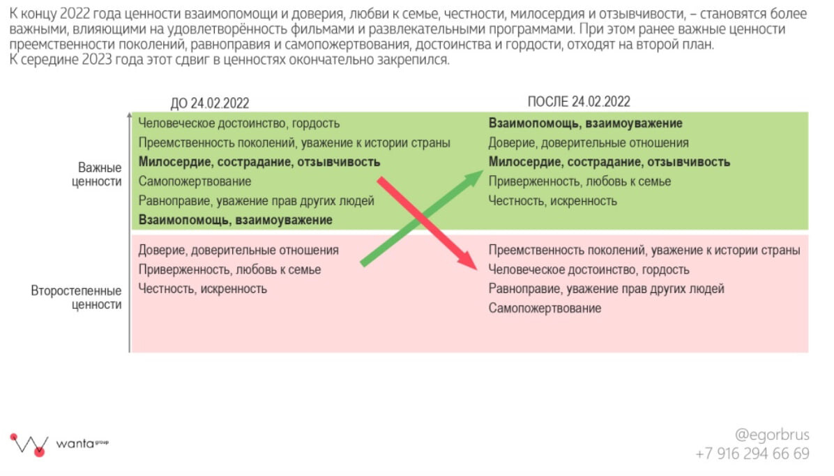 «Ценности меняются. Обычно это происходит медленно, но, когда случаютсямасштабные события, сдвиг происходит быстрее. С начала прошлого года мыфиксируем шифт в ценностях россиян, к середине этого года сдвиг окончательнозакрепился», — сказал Егор Брус, управляющий партнер Wanta Group.