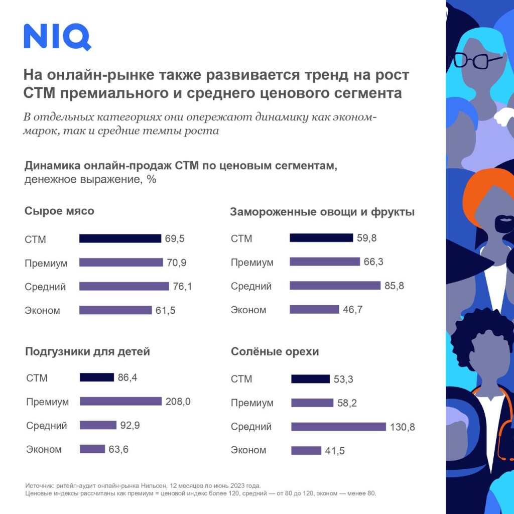 На онлайн-рынке выросли продажи собственных торговых марок (СТМ)премиального и среднего ценового сегмента за 12 месяцев по июнь 2023 г. Вотдельных категориях они опережают бренды категории «эконом», согласно даннымNielsenIQ.