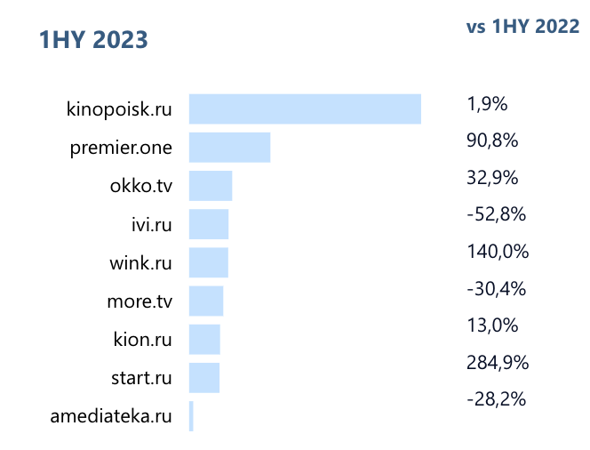 Второе место занял сервис Рremier — его расходы на рекламу увеличились на91%, на третьем оказался Okko с ростом на 33%. В топ также вошли Ivi, Wink,More.tv, Kion, Start и Amediateka.