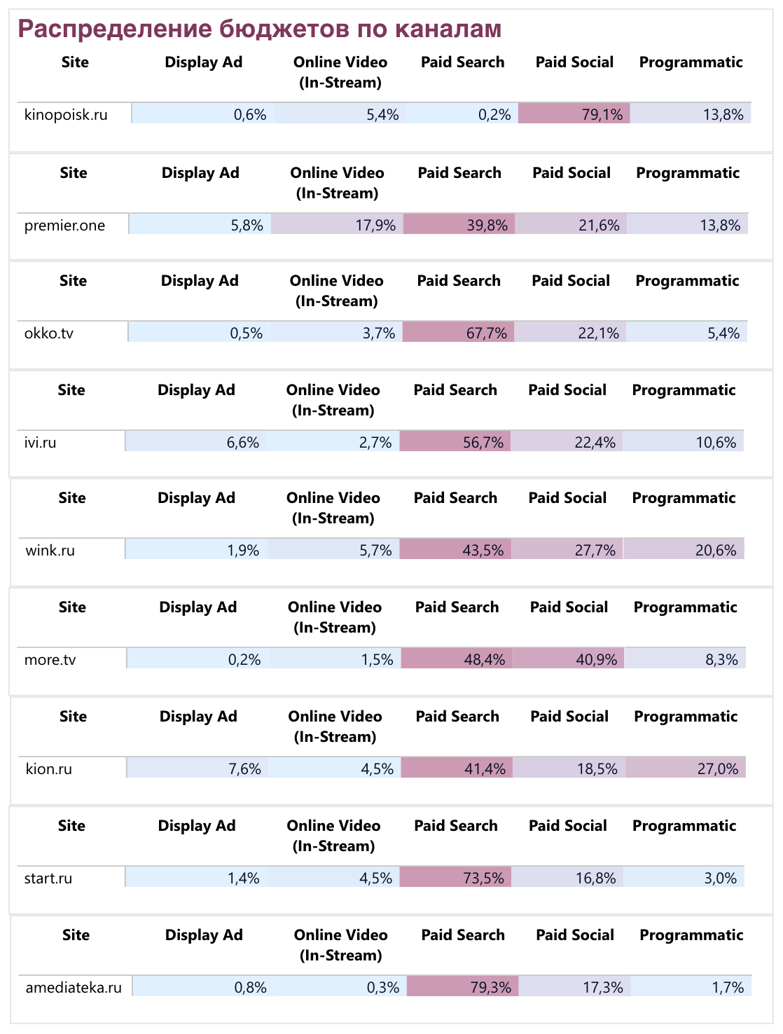 Что касается распределения по каналам, то у «Кинопоиска» основная долярекламных расходов приходится на соцсети — 79% всех затрат. У другихонлайн-кинотеатров затраты на инструмент Paid Social составляют более15%.