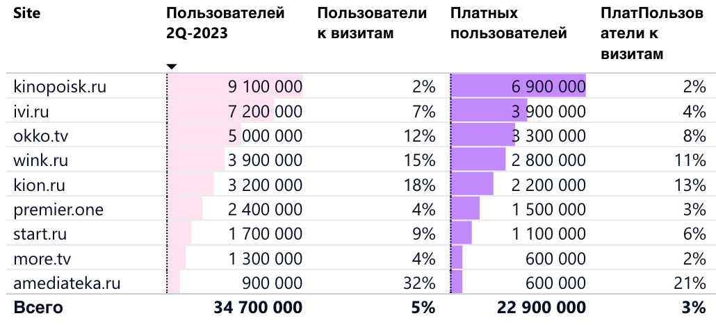 Больше всех пользователей во втором квартале 2023 г. у «Кинопоиска» —9,1 млн. И это количество составляет 2% от всех визитов на сайт. Уонлайн-кинотеатра также больше всего платных пользователей среди всеханализируем площадок — 6,9 млн (это тоже 2% от всех визитов на сайт). УAmediateka, наоборот, 900 тыс. пользователей, что составляет 32% от показателявсех визитов, платных пользователей 600 тыс. — это 21%.
