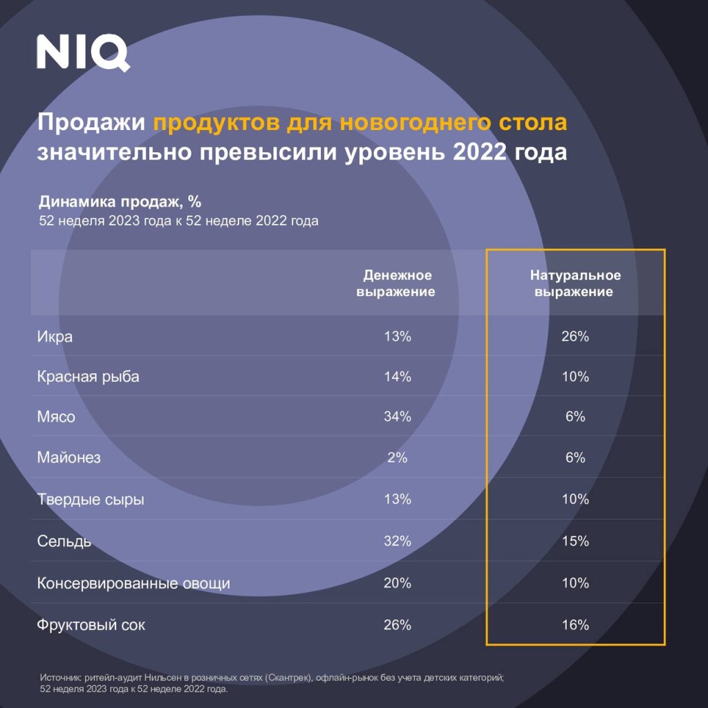 Побить прошлогодний рекорд удалось практически всем категориям, которыесоставляют основу праздничного стола. Продажи икры увеличились на 26% год кгоду в натуральном выражении и на 13% в деньгах. Динамика продаж красной рыбысоставила 10 и 14% соответственно, мяса — 6 и 34%, майонеза — 6 и 2%, твердыхсыров — 10 и 13%.