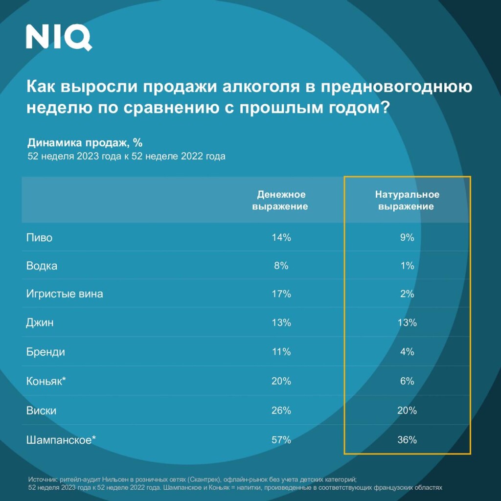 Аналогичный тренд прослеживается и в группе алкоголя. Продажи пива вырослина 9% в натуральном выражении и на 14% в денежном год к году, водки — на 1 и 8%соответственно, игристых вин — на 2 и 17%, джина — на 13 и 13%, бренди — на 4 и11%.