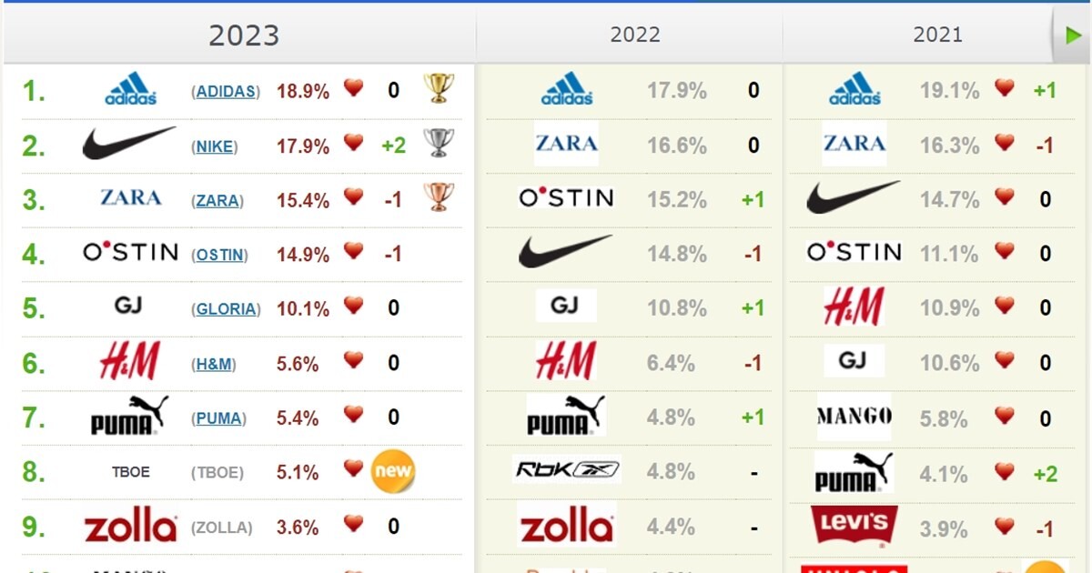 Марка Adidas третий год подряд занимает первое место в рейтинге самыхлюбимых брендов одежды россиян. Второе место Zara уступила Nike, спустившись натретью строчку, по данным исследовательской компанииOMI (Online Market Intelligence).