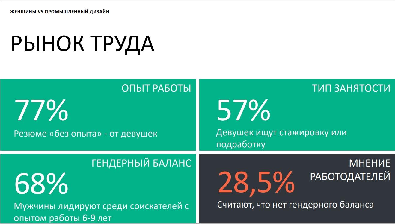 Около 80% студентов кафедр промышленного дизайна — девушки. При этом напрактике оказывается, что 90% сотрудников студий — мужчины. И это характерно нетолько для России. По данным исследования Музея дизайна Великобритании,проведенного в 2018 г., доля женщин среди студентов, изучающих дизайн,составляет 70%, а доля женщин среди профессиональных дизайнеров — 20%.