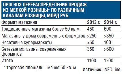 Их предположения косвенно подтверждаются результатами исследования, проведенного компанией INFOLine. В INFOLine подсчитали, что в результате перераспределения продаж из мелкой розницы в более крупные каналы сбыта уже в 2013 году сети и крупные магазины получат дополнительно примерно 1,1 трлн руб., в 2014 году 1,6—1,7 трлн руб. Львиная доля этих денег, около 950 млрд руб. за два года, по оценкам компании, достанется сетевым магазинам современных форматов, еще 700 млрд руб. перетечет в магазины «у дома». При этом доля сетевиков в обороте розничной торговли продовольственными товарами существенно увеличится, с 44% в 2011 году до 69% в 2014 году.