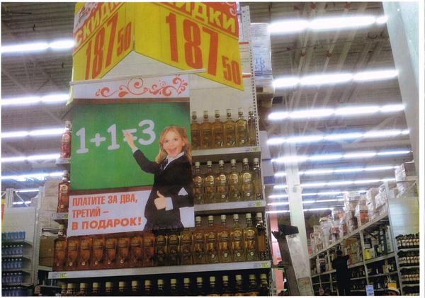 «В торговом зала магазина, расположенного во Всеволожском районе Ленинградской области на стеллажах с алкогольной продукцией распространялась реклама «1+1=3; Платите за два, третий в подарок»; «1=2; Платите за один – второй в подарок!» без предупреждения о вреде ее чрезмерного употребления. Причем на рекламных плакатах использовался образ школьницы, мелом пишущей на школьной доске», - говорится в официальном заявлении Ленинградского УФАС.