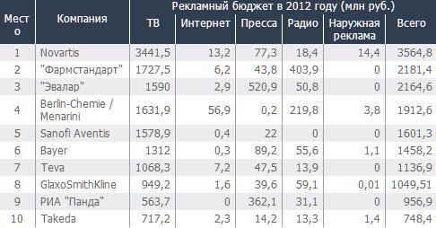 Фармкомпании являются ключевой категорией рекламодателей сразу для трех медиа — прессы, радио и ТВ. Так, по оценке аналитического центра 'Видео Интернешнл' (АЦВИ), в 2012 году производители лекарств и БАД потратили на их продвижение в центральной прессе 3,17 млрд руб. без НДС, что составило 11,5% всех рекламных доходов издателей. По этому показателю категория заняла первое место. На радио она, по подсчетам компании 'Зефир Медиа', была на втором месте после автопроизводителей: в прошлом году на фармкомпании пришлось около 15% всех бюджетов, выделенных на радиорекламу, или 2 млрд руб. На ТВ, по данным АЦВИ, лекарства и БАД также занимают второе место с 15,66 млрд руб., или более 11% всех рекламных доходов телеканалов. Больше в прошлом году тратили только производители продуктов питания.
