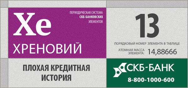 СКБ-Банк еще осенью 2012 года запустил рекламную кампанию, в рамках которой клиенты финорганизации создают «Периодическую систему СКБ-банковских элементов». В частности, плохая кредитная история в рамках этой системы называется «хреновий», зарплатная карта — «бубний», оплата ЖКХ — «унитазий», ипотека — «безтещий», вклад — «куркулий», кредит — «когданадий».