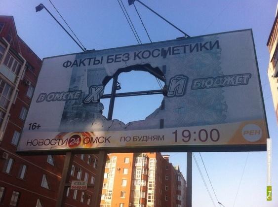 На этот раз очередь за телеканалом РЕН ТВ. На их билбордах красуются дыры в самом центре плакатов с надписями «В Омске х…е дороги», «В Омске х…я экология» или «В Омске х…й бюджет». Реклама появилась в городе около недели назад и своей дерзостью вызвала бурную реакцию омичей. Про экстравагантные билборды заговорил весь интернет, фото моментально распространились по соцсетям и блогам, о них узнали и в других городах.