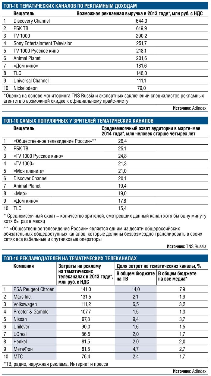 Одни тематические каналы продают рекламу самостоятельно, другие являются клиентами сейлз-хаусов, обслуживающих эфирных вещателей. Группа «Видео Интернешнл» сотрудничает, в частности, с каналами семейства Discovery, а «Газпром-медиа» - с Viacom (MTV, Nickelodeon, Paramount Comedy). И зачастую рекламодатели выделяют бюджеты на тематическое ТВ, только чтобы оптимизировать сделки на эфирных каналах. Показательно, что в составленном AdIndex топ-10 крупнейших рекламодателей на тематическом ТВ фигурируют производители товаров повседневного спроса, для которых основным медиа являются эфирные каналы. Так, Procter & Gamble в 2013 году потратил на кабельное и спутниковое ТВ 107,7 млн руб. с НДС, что составляет всего 1,5% его телевизионного бюджета и 1,3% общих затрат на рекламу.