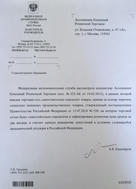 Федеральная антимонопольная служба (ФАС) одобрила инициативу Ассоциации компаний розничной торговли (АКОРТ) по заморозке цен на социально значимые продукты. Это следует из документа антимонопольного ведомства, оказавшегося в распоряжении РБК. Ранее АКОРТ направила в ФАС соответствующее обращение.В ответном документе «О рассмотрении обращения» сказано, что ФАС считает данную инициативу «допустимой в условиях сложившейся экономической ситуации в Российской федерации».