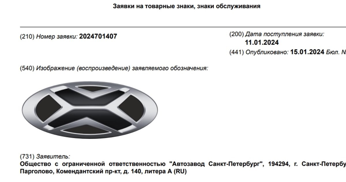 Дочерняя компания АвтоВАЗа — ООО «Автозавод Санкт-Петербург» — подала заявкив Роспатент на регистрацию двух вариантов товарного знака. Логотипыпредставлены в виде буквы Х в овале. На одном из знаков элементы окрашенысерым цветом. В другой заявке эмблемачерно-белая.