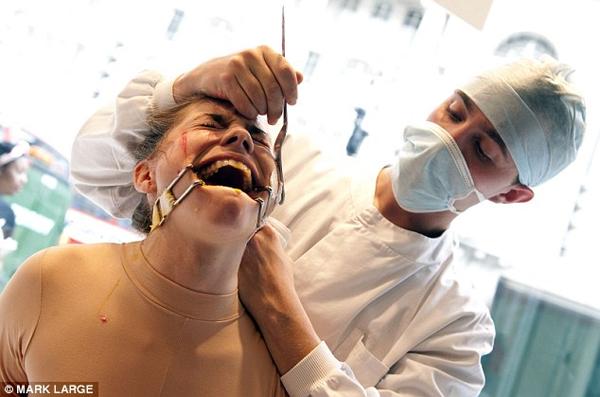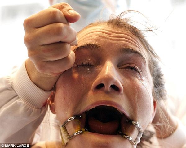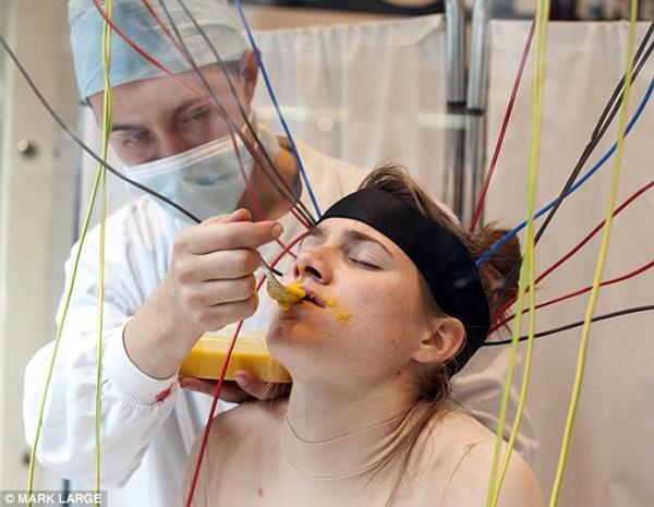 Актриса была одета в обтягивающий комбинезон телесного цвета. В рот ей вставили распорку, не позволяющую его закрыть, голову наполовину побрили и подключили к ней электронные датчики. В глаза актрисе закапывали 'тестируемое' вещество, намазывали на лицо крем. Кормил актрису ассистент по часам.