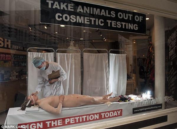 Косметическая компания Lush провела акцию, в рамках которой поместила актрису на витрину одного из своих магазинов на людной улице Лондона, сообщает The Huffington Post. Над актрисой в реальном времени совершались манипуляции, аналогичные тем, что совершают с животными во время косметических тестов. Девушка провела в витрине около 10 часов
