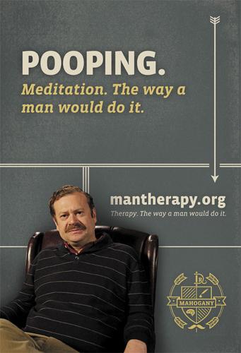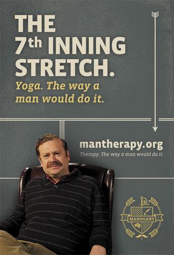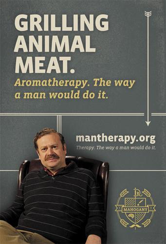 Постеры, главным теглайном которых является фраза: «Терапия. Как мужчина может сделать это», предлагают шашлыки вместо ароматерапии, основательный поход в туалет вместо дурацкой медитации и растяжку с разминкой вместо гейской йоги. Подставки в барах содержат надписи: «Женщины…я выписал мужчинам рецепт на половой акт. С вами. По меньшей мере, четыре раза в неделю».