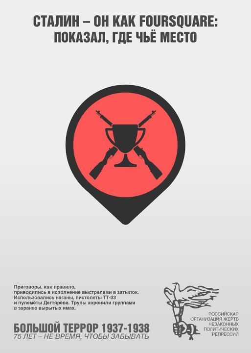 Принты сопровождаются соответствующей исторической справкой.Например, плакат 'Сталин - он как Foursquare: показал, где чье место'сопровождается следующим объяснением: 'Приговоры, как правило, приводились висполнение выстрелами в затылок. Использовались наганы, пистолеты ТТ-33 ипулеметы Дегтярева. Трупы хоронили группами в заранее вырытых ямах'.