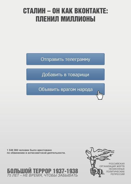 Российская общественная организация жертв незаконных политических репрессий опубликовала к 75-летию с начала Большого террора серию социальных принтов Сталин - он как, которые должны помочь поговорить с молодежью на понятном языке, рассказав о событиях того времени, пишет Большой город