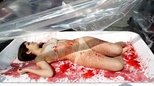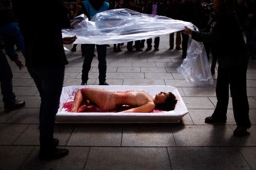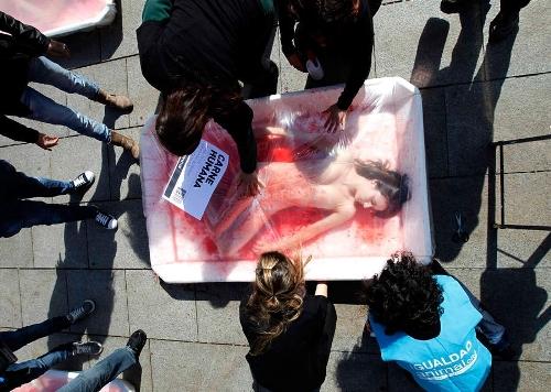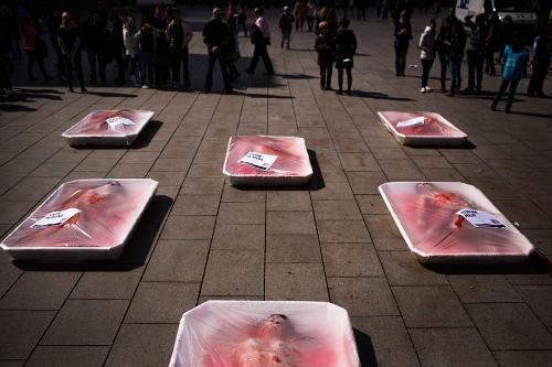 Несколько обнаженных женщин завернули в окровавленные пластиковые упаковки наподобие тех, в которые расфасовывают мясо для продажи в супермаркетах. Упаковки с надписями 'человеческое мясо' были выставлены на одной из площадей Барселоны.