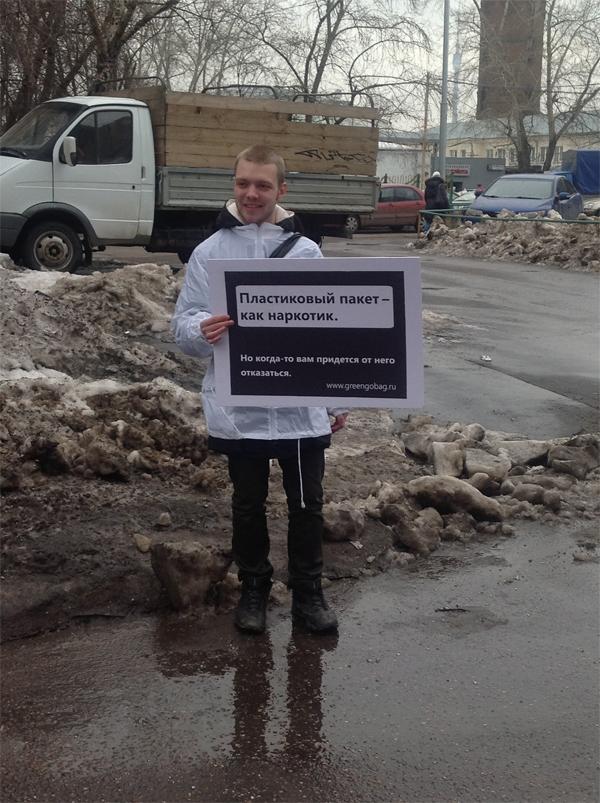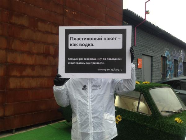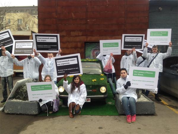 Впрочем, в России, как считают в компании, экология никому не нужна - так же, как и решение многих социальных проблем. Что и отражали лозунги на плакатах: Пластиковый пакет – как наркотик. Но когда-то вам придется от него отказаться. Пластиковые пакеты – как пособия в России. И толку мало, и не взять жалко. Эко-сумка в России – как бомж. Пока не имеет места жительства. Эко-сумка – как свобода слова в России. Одним нужна, другим не выгодна.