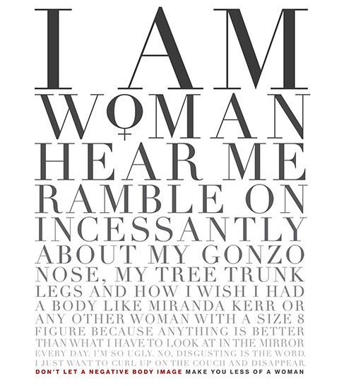 «Я женщина. Услышьте мое нытье о том, что у меня дурацкий нос, что ноги – как бревна, и что я хотела бы иметь тело, как у Миранды Керр или любой другой женщины с 42-м размером, поскольку все это лучше того, что я каждый день вижу в зеркале. Я такая уродливая. Нет, даже отвратительная. Мне просто хочется свернуться калачиком на диване и исчезнуть. Не позволяйте негативному восприятию своего тела умалить достоинства женской натуры».