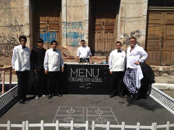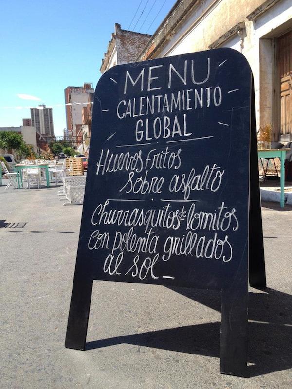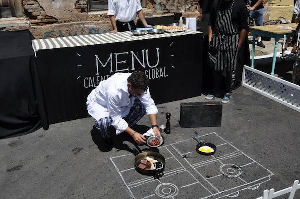 На тротуаре белым мелом была нарисована плита, с помощью которой повар и демонстрировал свои кулинарные изыски. Вывеска перед самодельным кафе гласила: «Меню глобального потепления. Глазунья, приготовленная на асфальте. Бутерброды с полентой на солнечном гриле».
