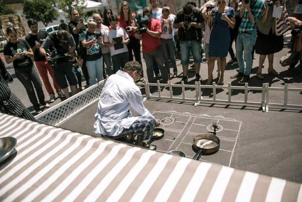 Вы когда-нибудь слышали поговорку: «При такой температуре можно жарить яйца на асфальте»? На многолюдной улице столицы Парагвая, города Асунсьона, известный шеф-повар Родольфо Ангеншейдт (Rodolfo Angenscheidt) провел мастер-класс по приготовлению пищи прямо на раскаленном асфальте. Как сообщает DesignTaxi, акция посвящена популяризации проблемы глобального потепления и изменения климата на планете Земля среди жителей Парагвая.