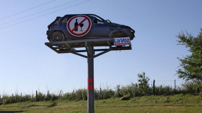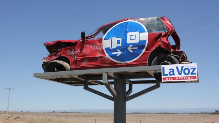 В провинции Кордоба дорожные аварии являются главной причиной высокой смертности. На дорогах, конечно, есть все необходимые знаки, но водители не уделяют им должного внимания. Чтобы изменить ситуацию, разбитые вдребезги машины были взяты со свалки и расставлены вдоль дорог в качестве держателей для знаков.