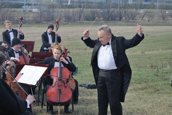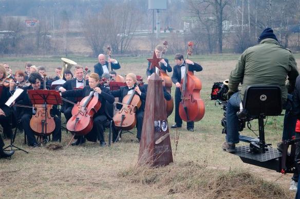 Сценаристы ролика решили исполнить мечту героев фильма. Одновременно с фразами Быкова и Смирнова появляются кадры, на которых люди во фраках и с музыкальными инструментами в руках идут по полю к солдатской могиле. Их сыграли участники Национального президентского оркестра Украины под руководством дирижера Сергея Золотарева. Музыканты рассаживаются вокруг памятника-обелиска с красной звездой и начинают играть ту самую мелодию.