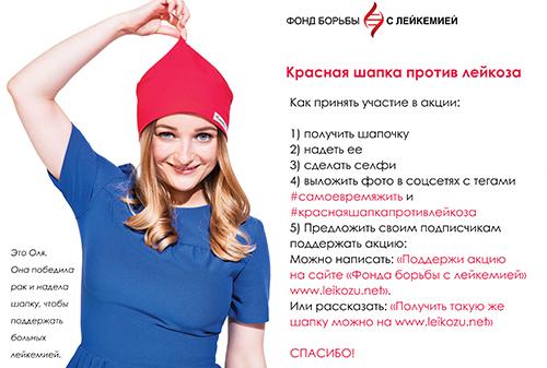 Чтобы привлечь внимание к помощи взрослым больным раком крови, в социальных сетях был запущен флешмоб. Суть его в том, чтобы сделать селфи в шапке, поставить теги #самоевремяжить и #краснаяшапкапротивлейкоза и рассказать о проекте. К флешмобу уже присоединились Андрей Макаревич, Павел Кабанов, Влад Лисовец, Оксана Федорова, Александр Красовицкий (Анимал Джаz), группа АнимациЯ, Вячеслав Петкун и многие другие.