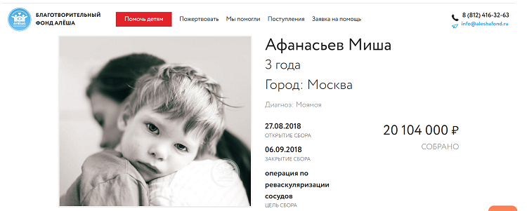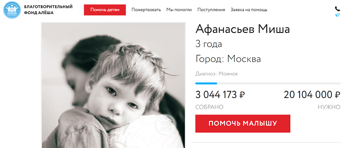 Сбор на сайте фонда: https://www.aleshafond.ru/children/afanasev-misha ! Чтобы сделать пожертвование адресно Мише, нужно нажать кнопку на его страничке на сайте. !! Сумма сбора обновляется раз в 3 дня, не пугайтесь, если сразу не увидите свой перевод.'