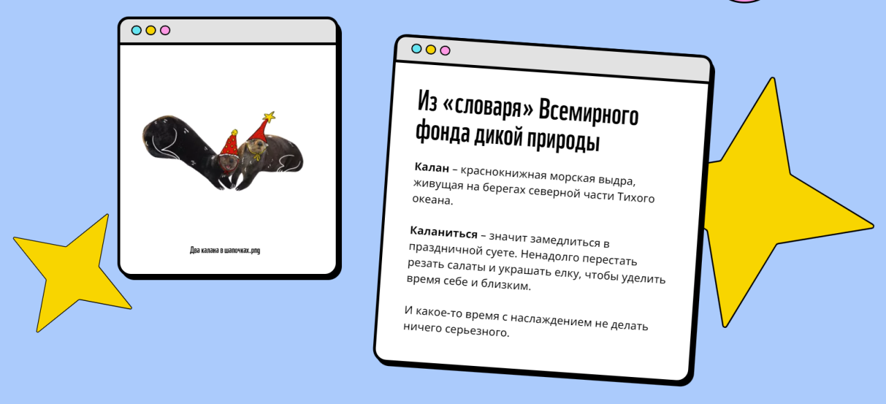 В рамках благотворительной кампании Всемирный фонд дикой природы (WWF)запустил флешмоб #якаланюсь в социальных сетях. Насайте проекта можноопределить, какой вы новогодний калан, а также помочь сохранить популяцию вида.В благодарность каждый участник получит набор поз выдра-йоги и стикерпак.